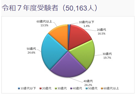 - 受験者のボリューム層:50歳代が最多。社会人経験を活かそうとする「大人の受験者」が非常に多いのが特徴です。